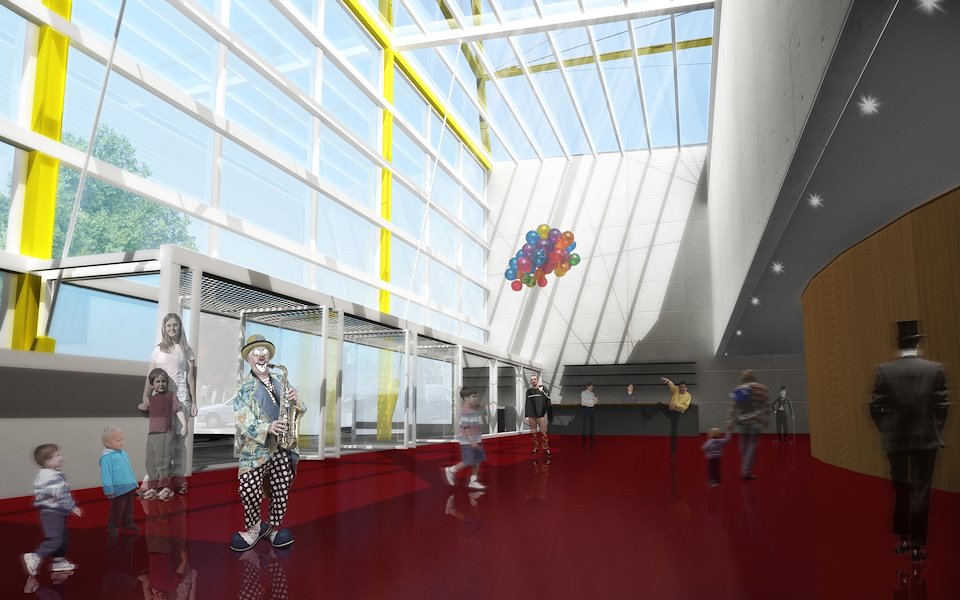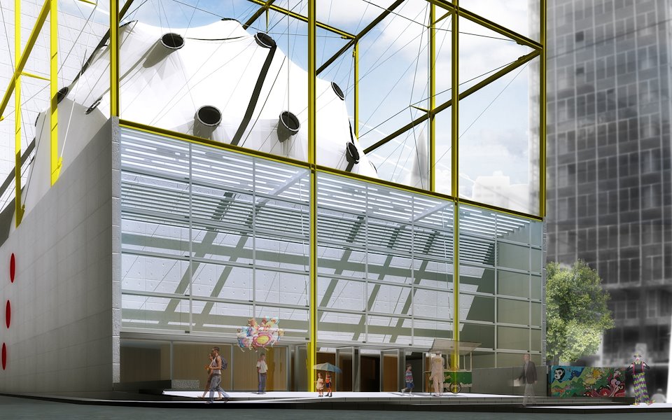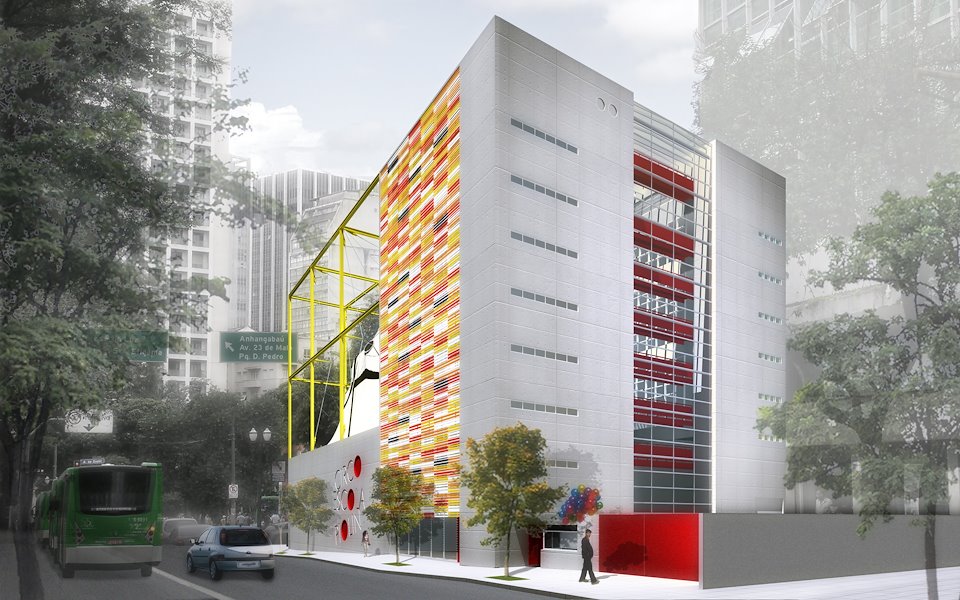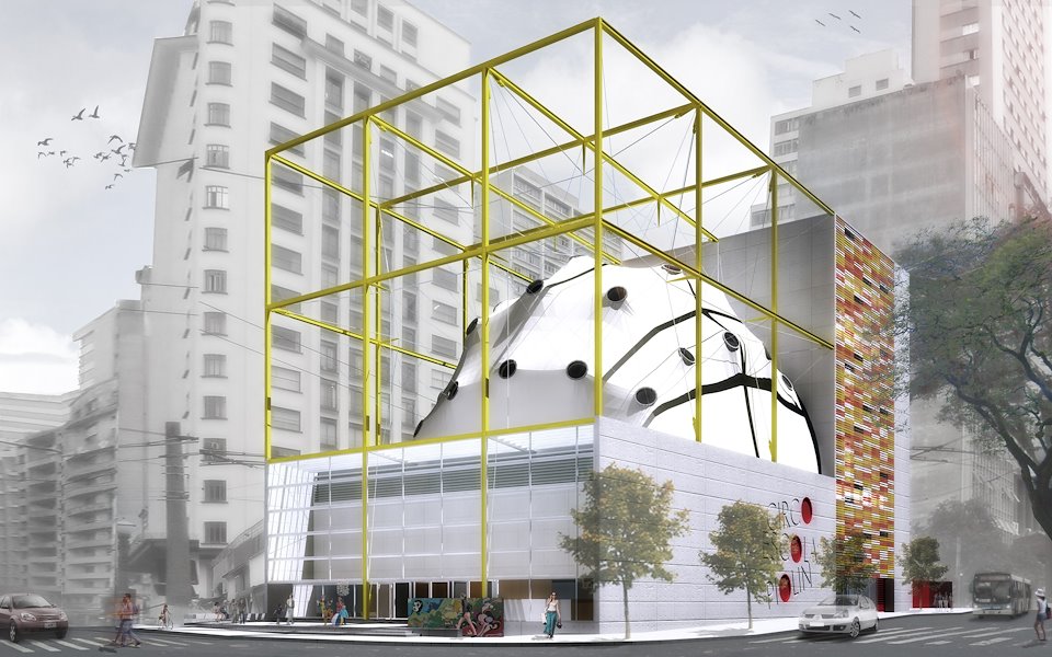 The Piolin Circus School is an initiative of São Paulo’s City Government directed to children and teenager’s development through educational and artistic activities. The architectural program comprises two main functions – a Venue for Spectacles and the School building, with its classrooms, workshops and administrative offices. The access for the Spectacle area is located by the Paissandu Plaza, a busy hub in downtown Sao Paulo. At its the center, the arena is the heart of the design. This space follows the vernacular features that define the circus typology: the ring surrounded by ascending seating and covered by a tensile structure. The School building, with its access from the opposite side of the site, is positioned immediately behind the arena and connected to it by a rehearsal atrium. The concrete, sharp volume of the School contrasts with the expressive and light structure of the Spectacles Venue, reinforcing its visual impact.