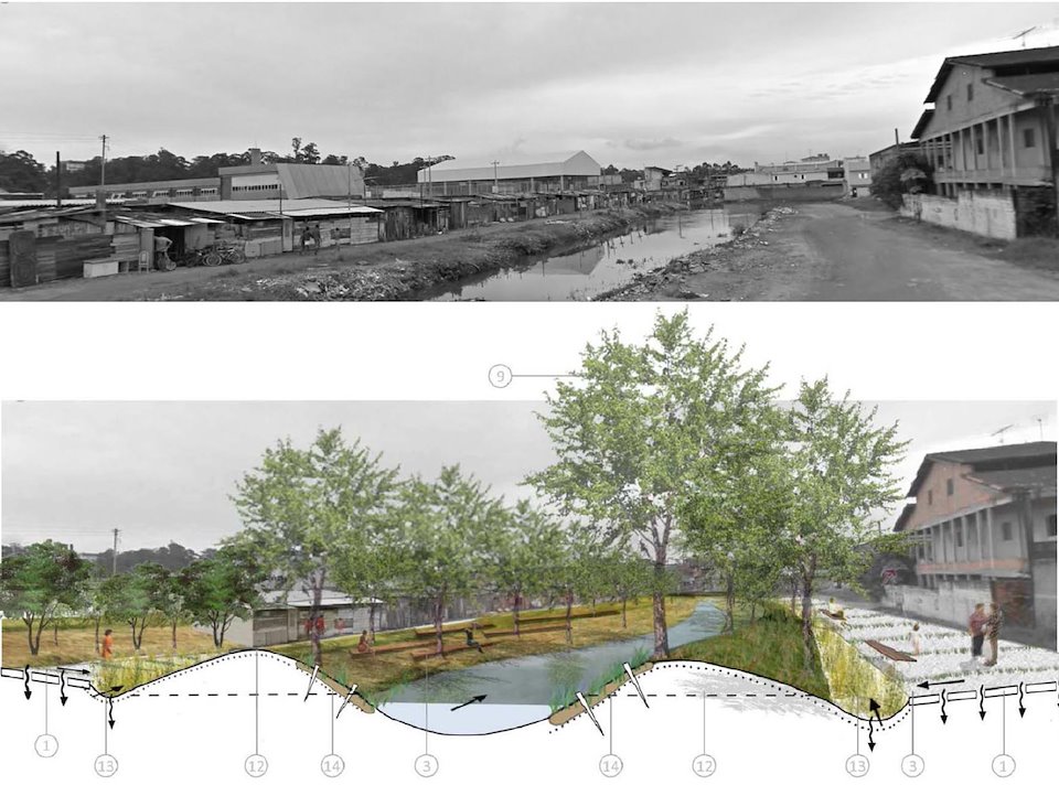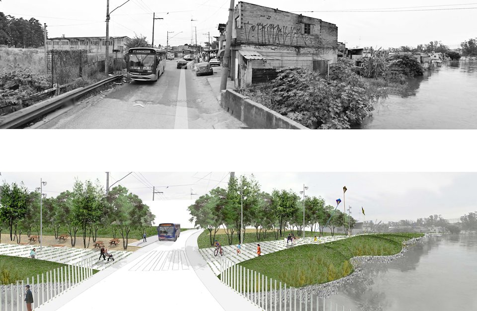 The 4,582,401m2 area within the Perimeter of Urban Intervention Agua Vermelha 2, in the East side of Sao Paulo City, was first occupied in the 80s with the formation of the Jose Martins Lisboa Slum. It currently holds 23 precarious settlements with 16,973 homes. The main challenges for the re-urbanization of this perimeter were to mitigate flood risk and to plan drainage and sewage systems while preserving watercourses and local environment and providing social and leisure spaces for the community.