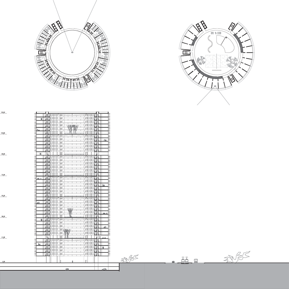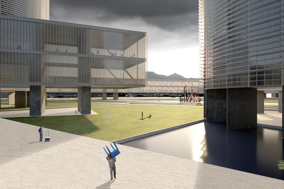 The organization of the architectural program seeks integration; there is no segregation of zones with different uses, but a vertical layering that goes from public to private. At ground level, the Master Plan proposes abundant commercial and services, shaded pathways, and dynamic routes permeated by public spaces for leisure. Over that, there is the element that articulates and connects the proposal. This is a linear, snake-like structure that hosts the Convention, Business and Exhibition Centres, Services and Hotels. Its proportions, long and relatively low, assure that it has a discrete expression in the landscape, ceding room for the city’s natural beauty to be appreciated. Symbolically, the elements that have the most substantial visual impact on the Master Plan are the housing towers. These punctual, high structures act as landmarks while also keeping enough distance between them to preserve the existing views.